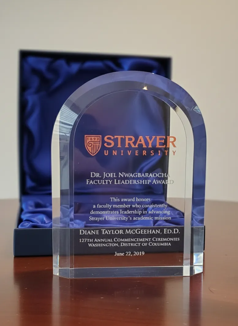 Her most notable recognition is the Strayer University Faculty Leadership Award (2019), honoring her consistent leadership in advancing Strayer University’s academic mission. Other honors include:
